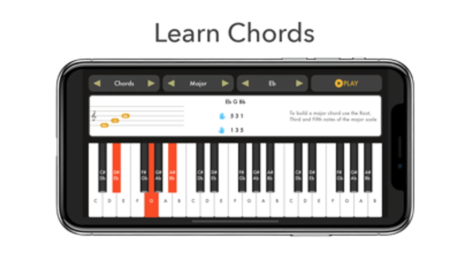 Just select the scale or chord in any key you want and hit "Play". The app will play it on keyboard and display all the of its notes and the formula used to build it.