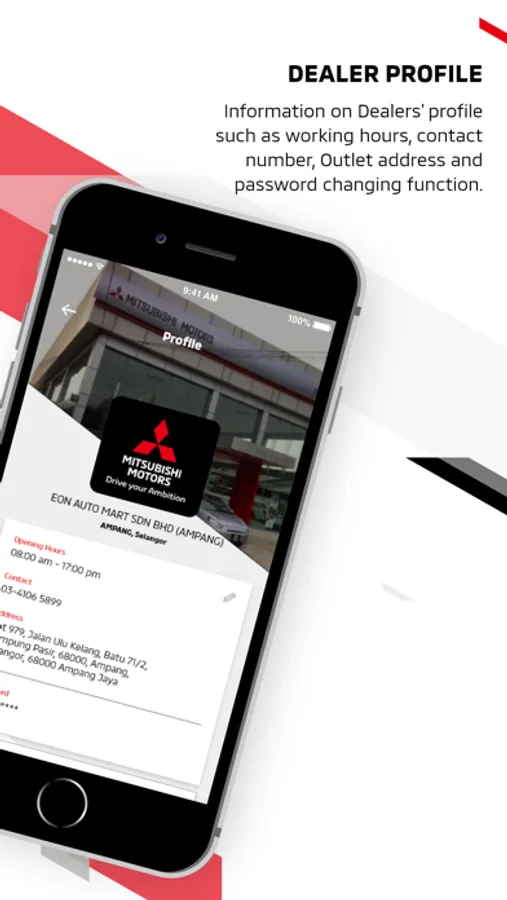 Information on Dealers' profile such as working hours, contact number, Outlet address and password changing function.