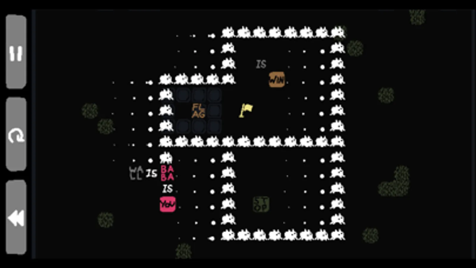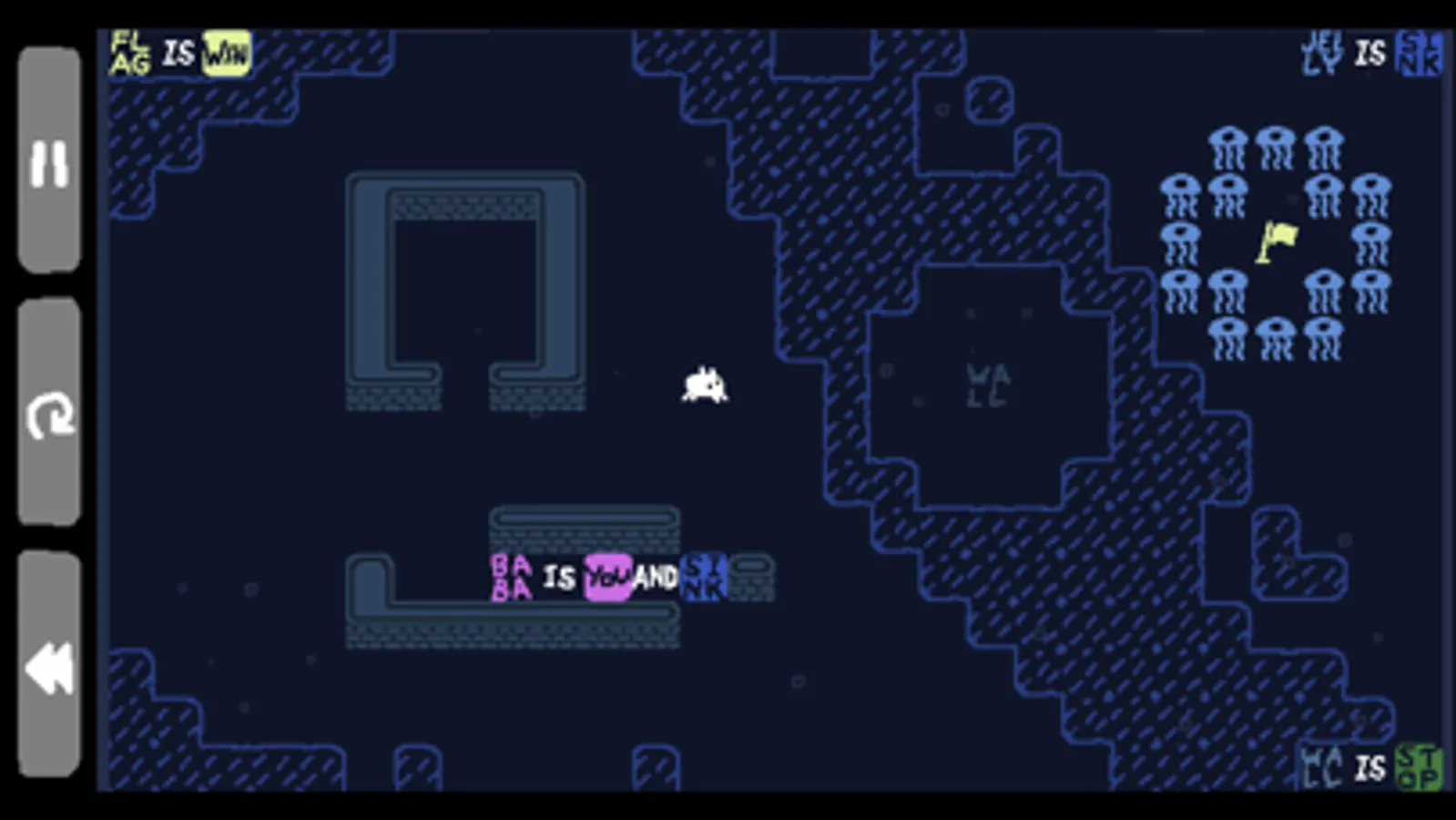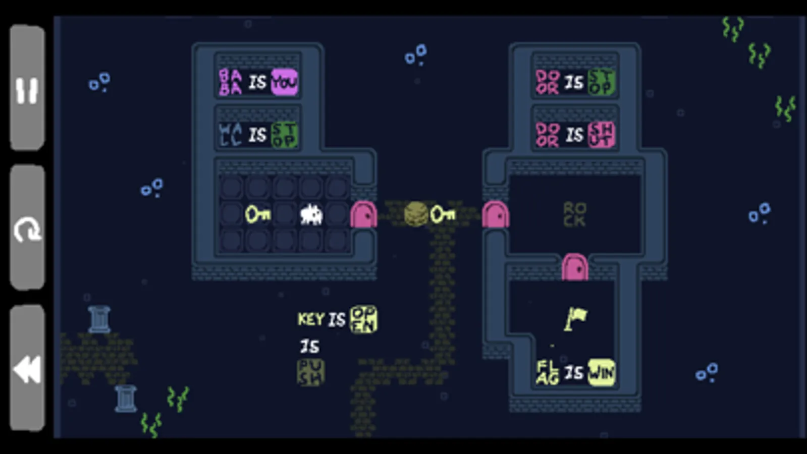Baba Is You is a puzzle game where you can change the rules by which you play. In every level, the rules are present as blocks you can interact with; by manipulating them, you can change how the level works and cause surprising, unexpected interactions! With some simple block-pushing you can turn yourself into a rock, turn patches of grass into dangerously hot obstacles, and even change the goal you need to reach to something entirely different.