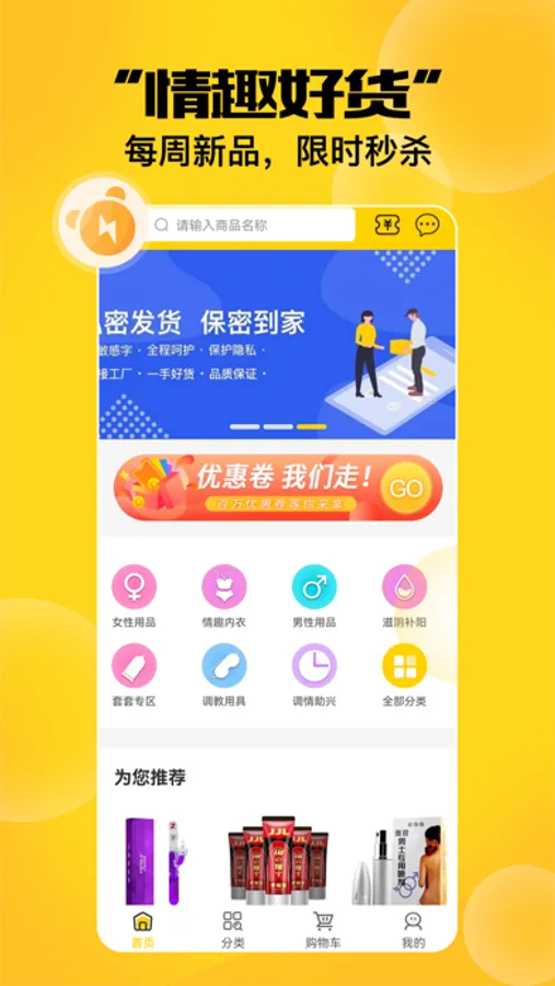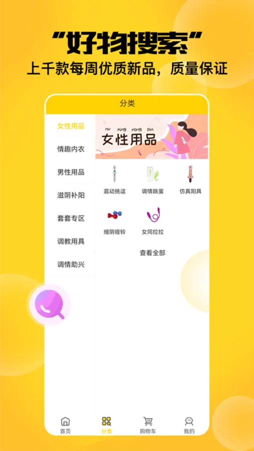 情趣社交创新领导者,上千款商品任你选择,更懂消费者的情趣社交购物APP,享受更高性价比的生活,品质商品更低价,会员包邮送到家,分享实惠,分享乐趣。