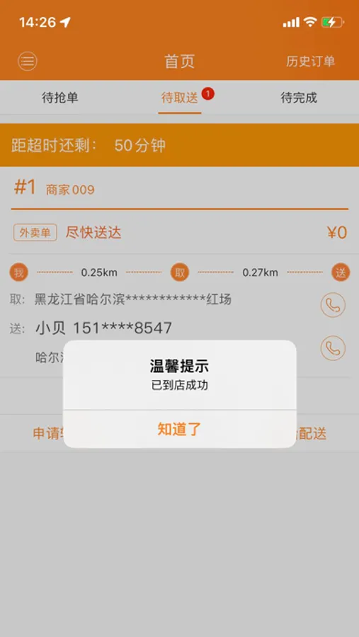 是一款具有抢单,取货,配送,以及配送记录的一款专用和禾适外卖配送人员打造的APP,支持新订单语音提醒,路线导航等一系列使用功能,方便配送人员使用!