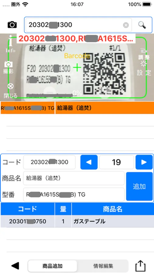 前者は、OCRで型番英数字の読取って、または、入力キーワードで検索して商品を特定して、指定枚数分の在庫ラベル(QRコード付き)を携帯プリンタで印刷する機能です。
