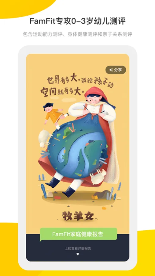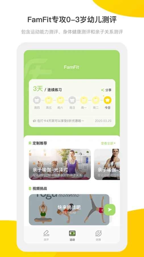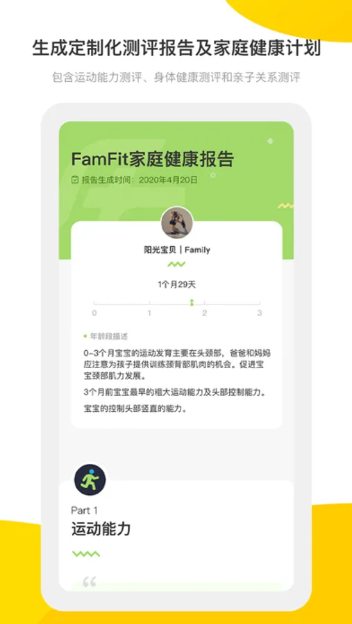 FamFit专攻0-3岁幼儿的测评,项目包含运动能力测评、身体健康测评和亲子关系测评部分,生成定制化测评报告及家庭健康计划。