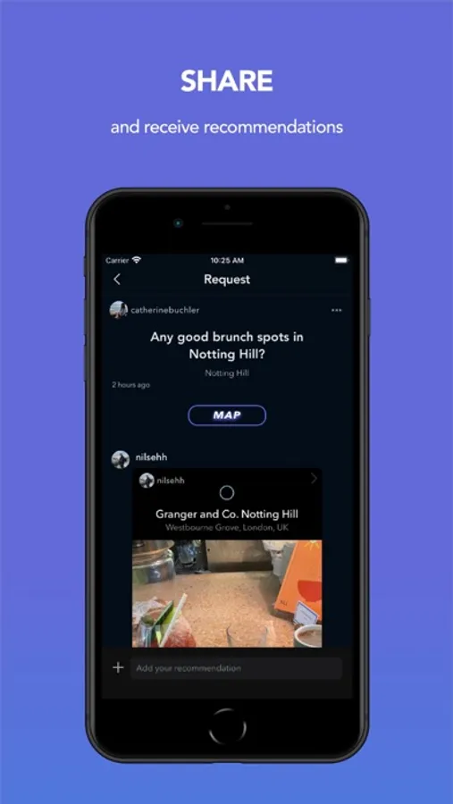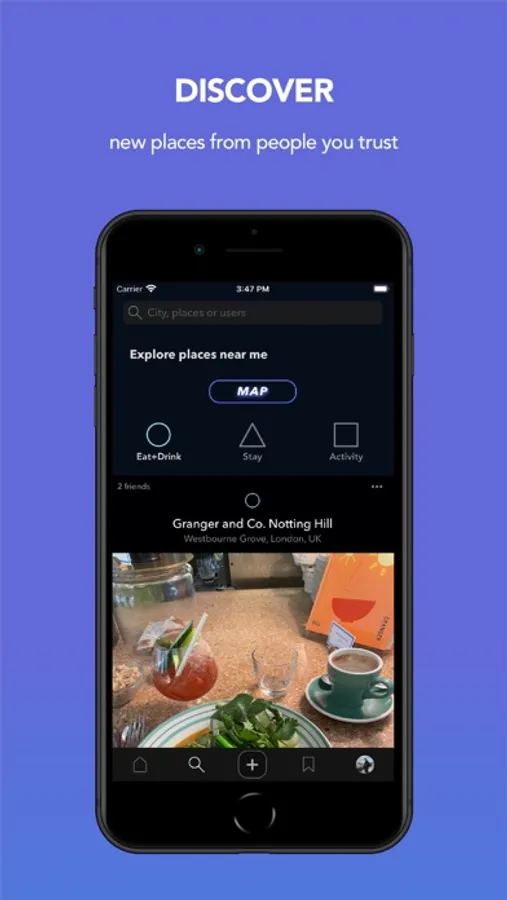 We want to make it easier for you to discover, store and share your favourite places in your local community or around the world. The app is built for use amongst friends - who’s taste you know and trust. On the app you can add all your favourite spots from your own photos and videos, create curated collections of anything from restaurants to record shops, and view all your places on a map. You can also save places you find on the app to make sure you never run out of spots for your bucket list! Use the app to ask for recommendations and to share your own. We hope you enjoy!
