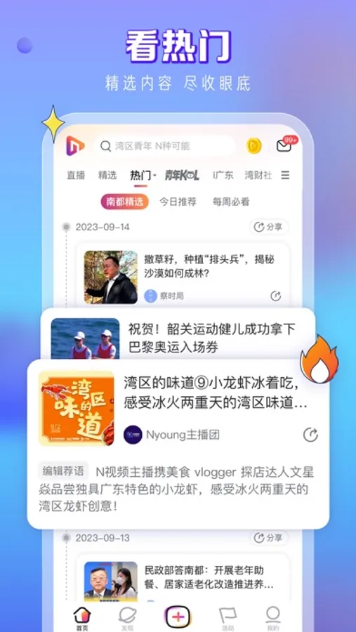来直播专区,和“N YOUNG主播团”一起走进新闻现场,沉浸体验民俗节日、文化展览、科技探索,有料又有趣的直播节目都在这里!