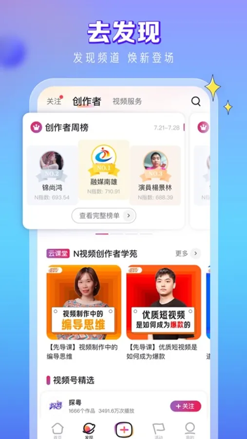 政务机构、教育医疗、街头艺术、方言文化……超20000名各领域头部创作者已经入驻 N 视频,有思想、有温度。更有“广东省视频服务平台”全新上线,为链接创作者和省内融媒提供更强技术支持!一起探索视频创作的更多可能!
