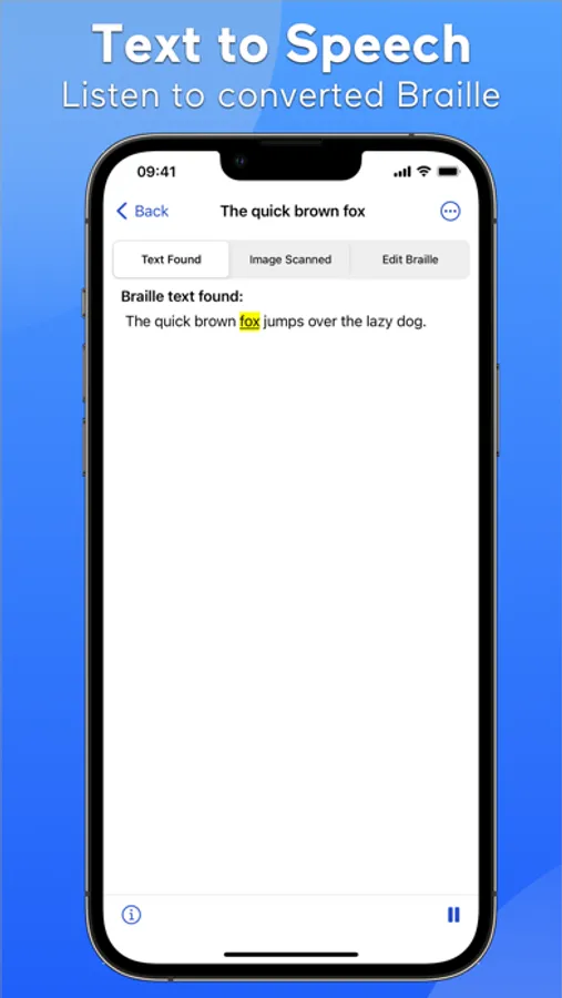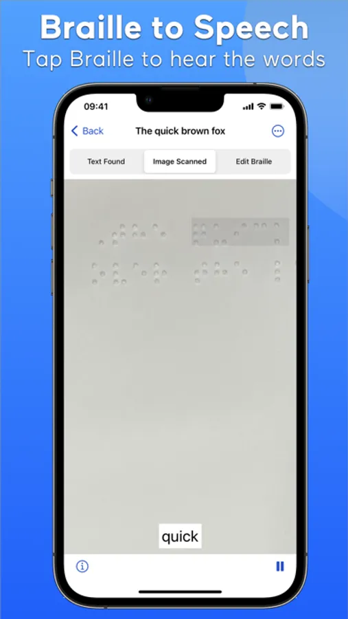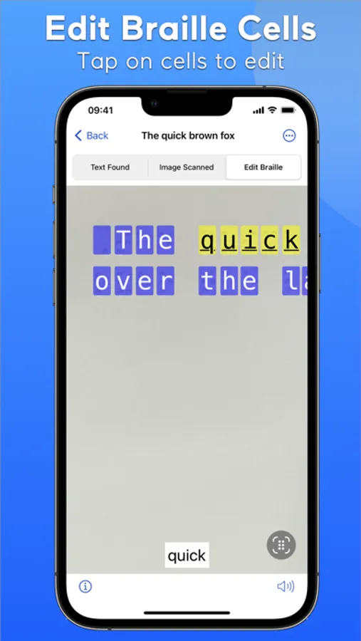 Using a combination of computer vision to locate the page and Machine Learning to match Braille to letters, Braille Scanner can show English letters above the Braille. The matched text can be copied for use in other applications, or spoken via Text-To-Speech.
