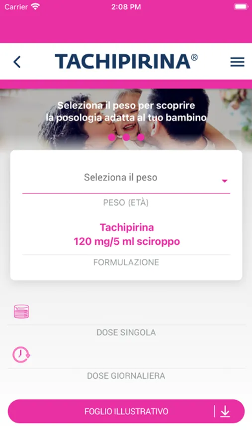 Seleziona la forma farmaceutica e la fascia di peso per ottenere il corretto dosaggio di Tachipirina.