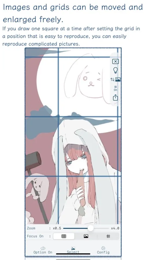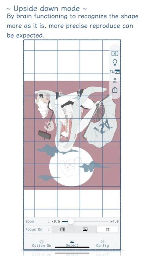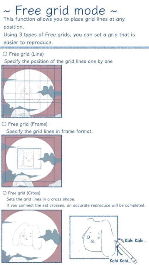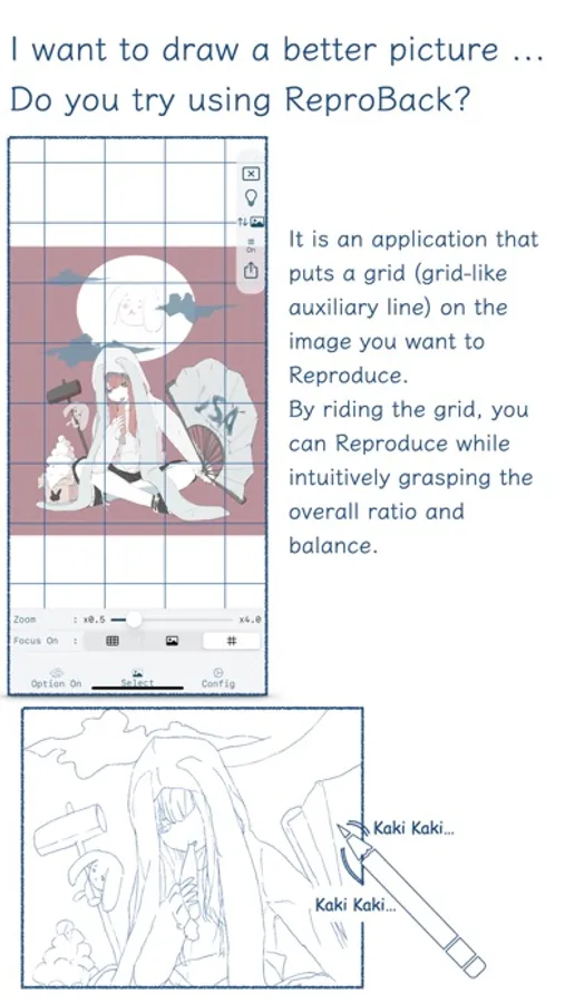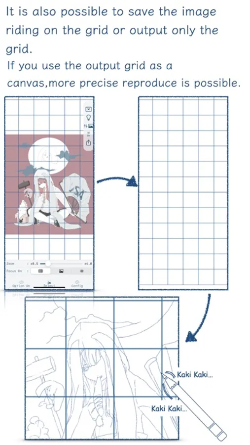 By placing a Grid-like auxiliary lines on the original image, you can make a Reproduce while always grasping the ratio of each part and the overall balance.