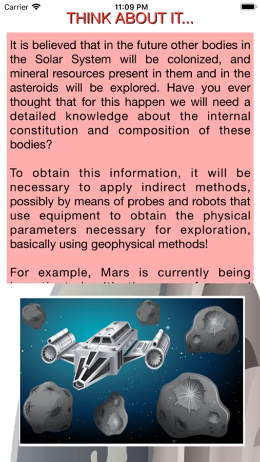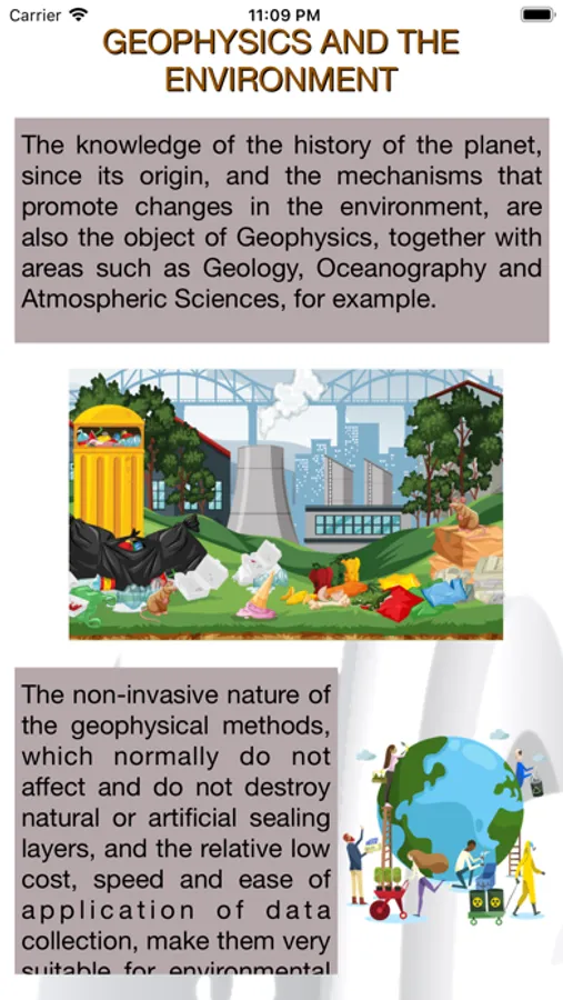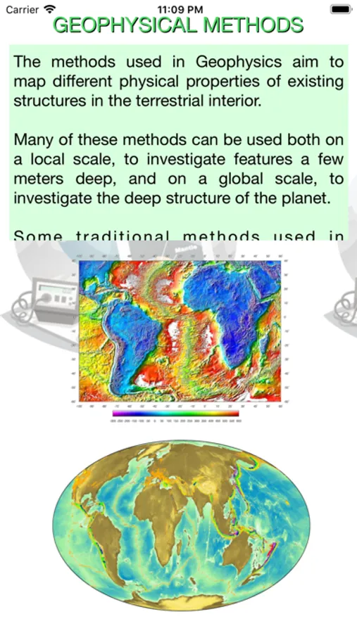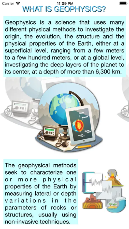 The application describes, in a simple way and with a lot of beautiful illustrations, some of the main geophysical methods and their applications, explaining how we can determine the physical parameters of the interior of the planet using information from its gravity field, current and past magnetic field, heat flow, response to the propagation of natural and artificial seismic waves, and its behavior when subjected to an electric field or electromagnetic waves, for example.