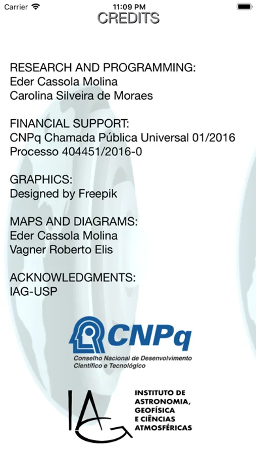 The application was developed with the support of CNPq, Universal Public Call 1/2016, Process 404451 / 2016-0, to whom we thank. Our acknowledgment also to Institute of Astronomy, Geophysics and Atmospheric Sciences of the University of Sao Paulo, Brazil (IAG-USP).
