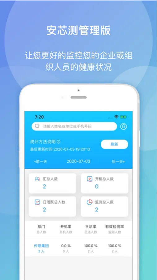 安芯测管理版,让您更好的监控您的企业或组织人员的健康情况。