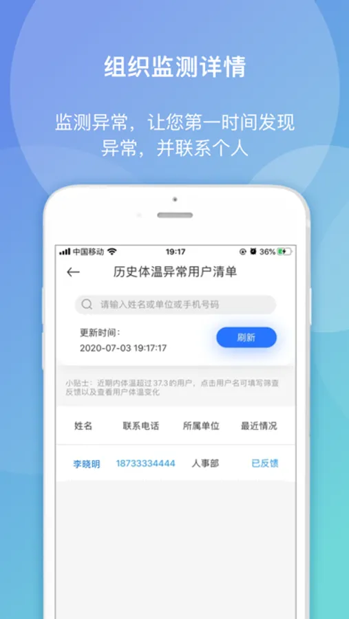 2. 体温异常人员及时报警,让您第一时间发现异常,并能够联系到个人,及时处理。