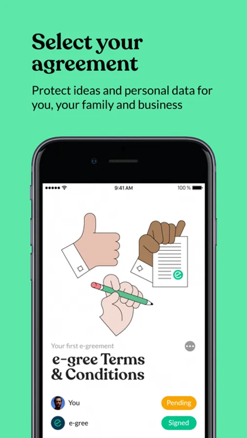 e-gree is an easy-to-use mobile app that features over 20 different contract templates for all kinds of situations, allowing people without a legal background to protect their ideas, assets, and intellectual property. e-gree is helping thousands of users build trust in their business and personal relationships — not with words, but with legally binding documents.