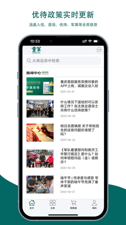 重军APP是在国家军粮办与重庆市发展和改革委员会支持指导下,由重庆市军粮供应服务中心为军人军属、退役军人及其他优抚对象打造的全方位的生活服务平台。