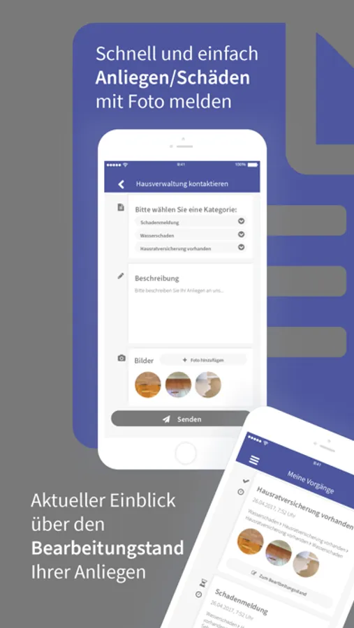 Als Mieter oder Eigentümer können Sie Schäden oder Anliegen direkt mit Fotos über unsere App melden. Ihre Anfragen stehen unseren Mitarbeiten dann zur Verfügung und können auch an Handwerksbetriebe weitergeleitet werden.