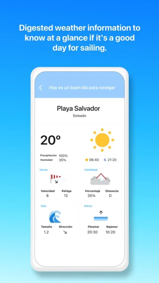 Know the weather forecast: Digested information to know at a glance if it is a good day to sail. Includes information on temperature, winds, visibility, waves and tide.