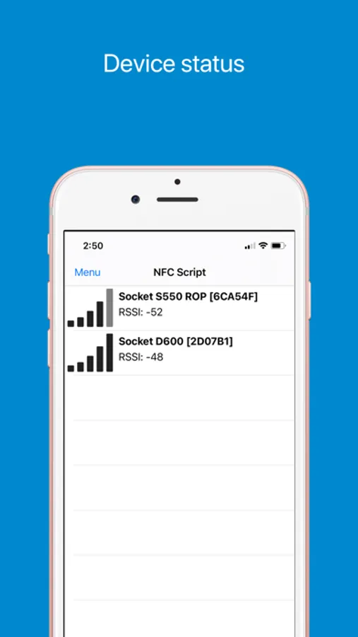 NFC Script is the reference application to work with the Socket Mobile D600 and S550 over a Bluetooth Low Energy connection.