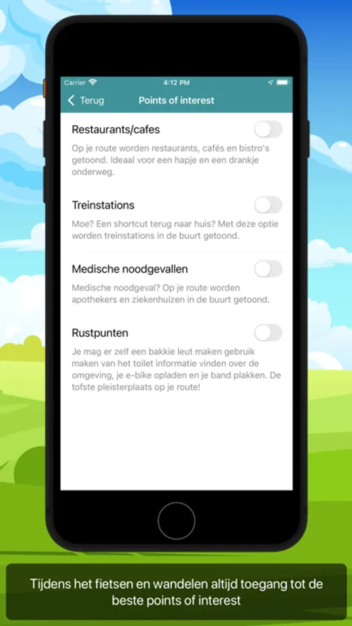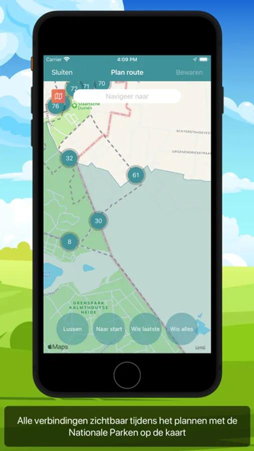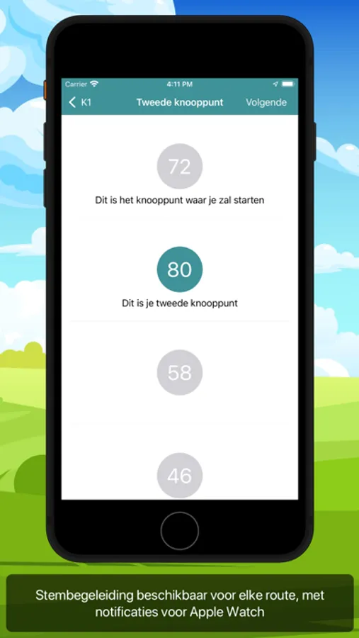 Stembegeleiding tijdens de activiteit laat je weten wanneer je een knooppunt nadert en laat je dit weten via gesproken stem en een notification die optioneel ook op je Watch wordt getoond. Kies het knooppunt waar je wil beginnen en geef je richting aan ... en de app doet de rest.