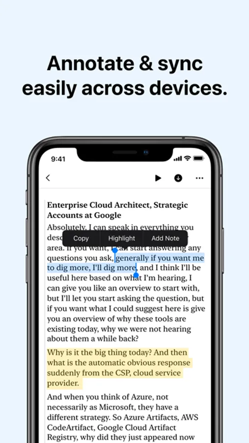 - Highlight and take notes on any transcript, instantly syncing across all devices