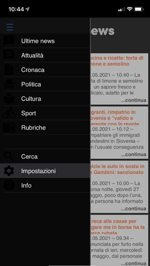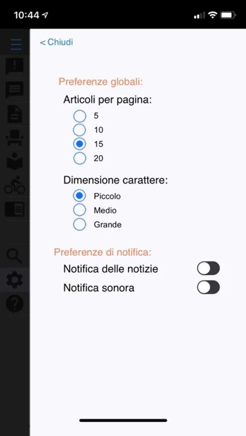 - Potrai configurare le opzioni della app relativamente alla grandezza del font ed al numero degli articoli da visualizzare