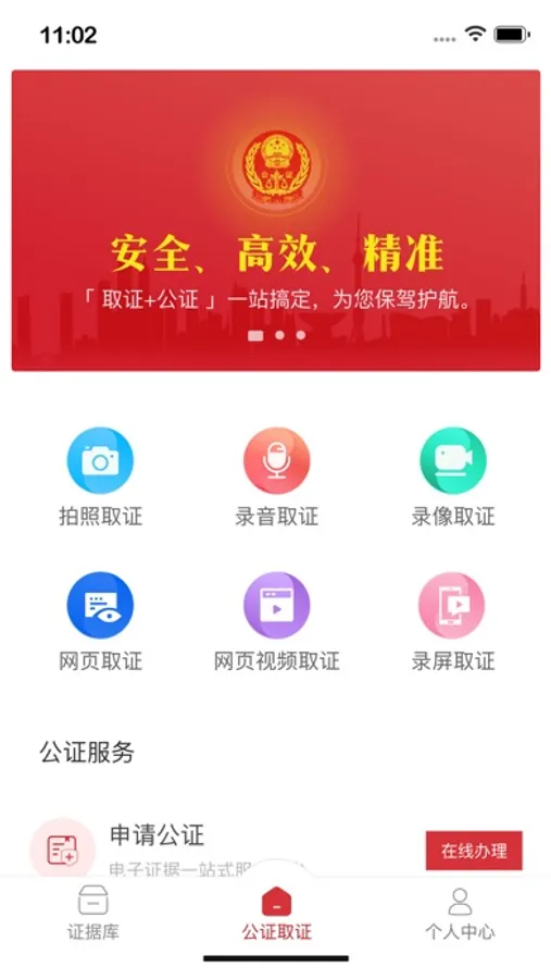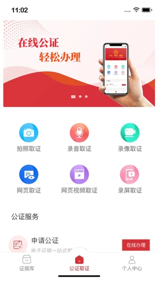 拍照取证、录音取证、录像取证、网页取证、网页视频取证、录屏取证、申请公证。