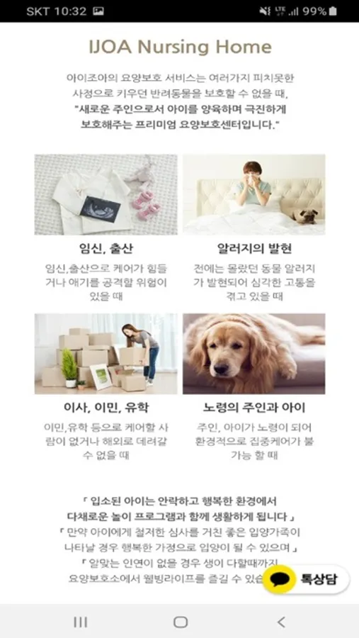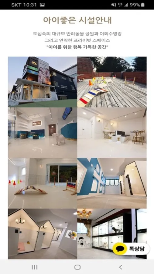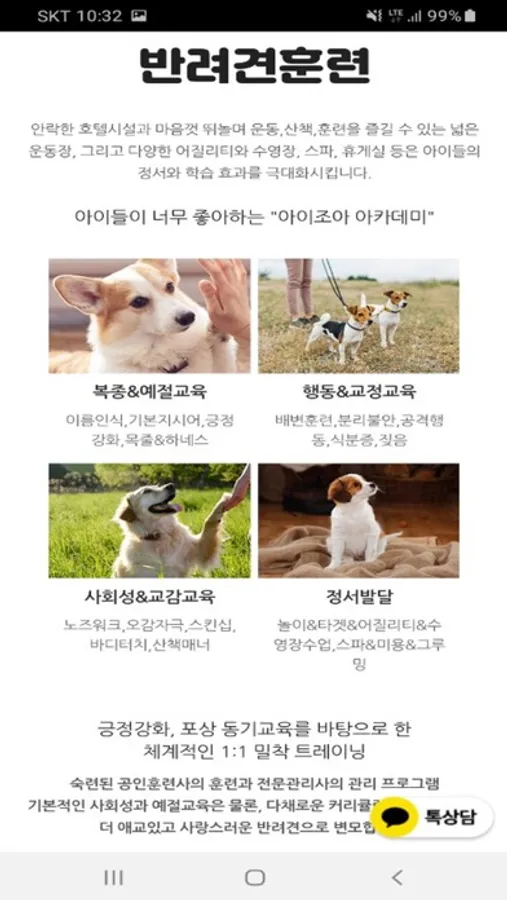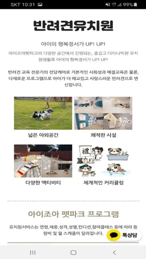 !숙련된 공인훈련사의 훈련과 전문관리사의 관리 프로그램으로 기본적인 사회성과 예절교육은 물론, 다양한 어질리티와 수영장, 스파, 휴게실 등은 아이들의 정서와 학습 효과를 극대화시킵니다.