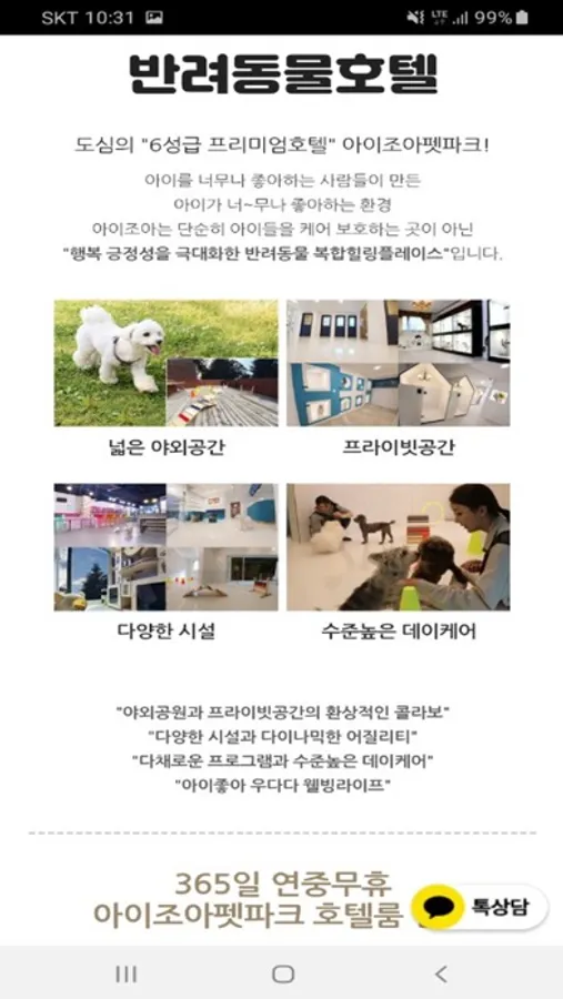안락한 호텔시설과 강아지,고양이 모두 마음껏 뛰놀며 운동,산책,훈련을 즐길 수 있는 대규모 반려동물 공원과 수영장