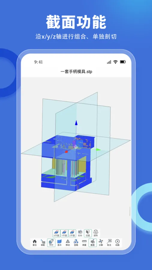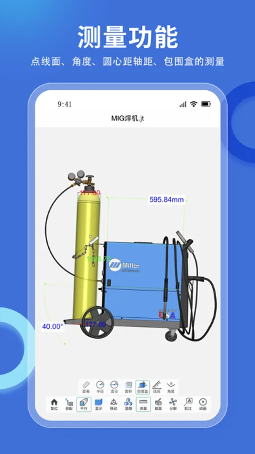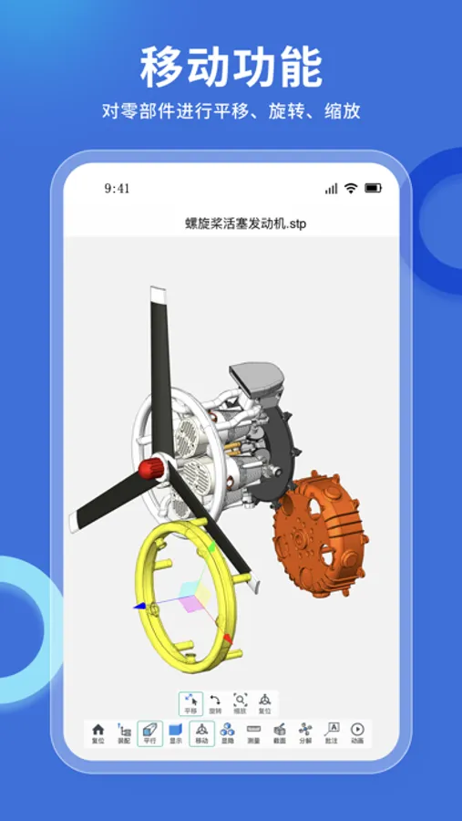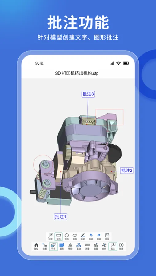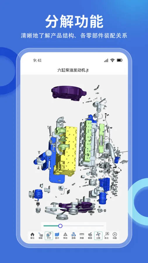 No need to install CAD software, you can quickly browse 3D models such as JT, UG, CATIA, Pro/E, STEP, etc. on your mobile phone, support 3D model assembly structure viewing, 3D measurement, 3D part manipulation, 3D model decomposition, 3D view saving, Add annotations and other 3d visualization features.