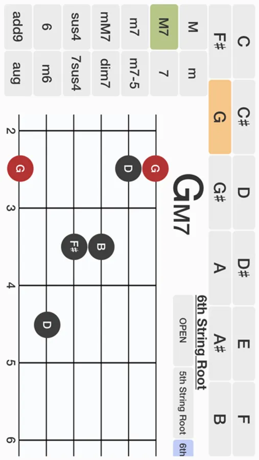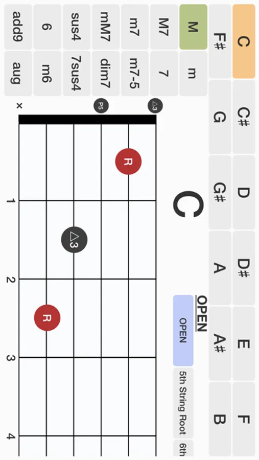 - Choose a note name from buttons on the top of the screen and you can set the root note of the chord.