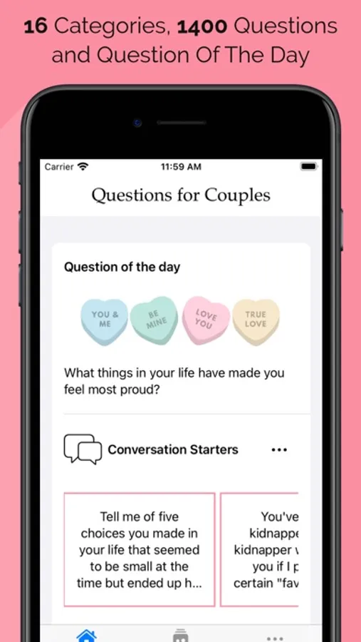 • 16 categories of questions including topics such as fun questions, deep questions, and intimate questions so you can pick the perfect category for the occasion