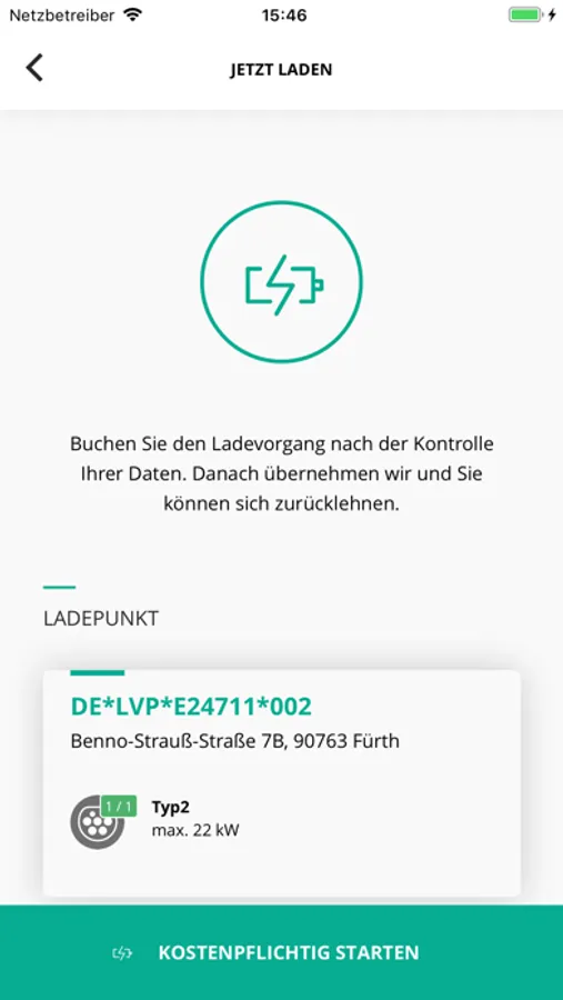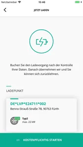 Sobald Sie Ihr Fahrzeug mit der Ladestation verbunden haben, können Sie den Ladevorgang bequem über die App freischalten. Sie erhalten neben weiteren Informationen zum Standort auch Informationen über die aktuell gültigen Nutzungsgebühren.