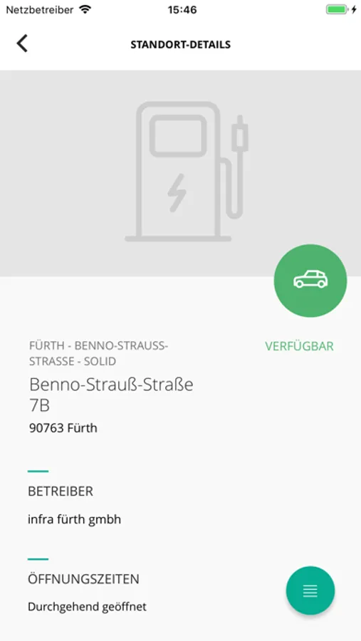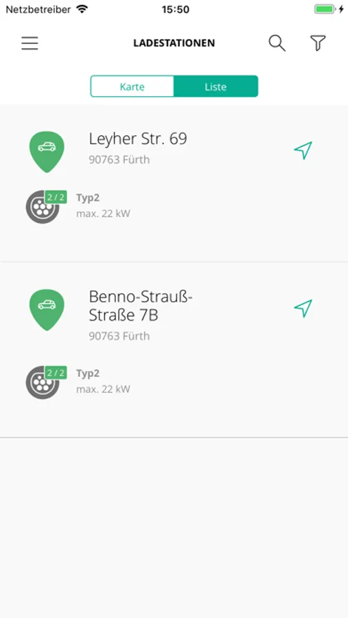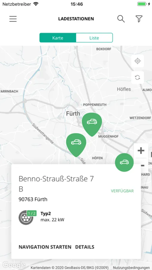 Die Übersichtskarte zeigt Ihnen an, wo Sie die nächste Ladestation finden. Die Farbgebung der Markierung zeigt die aktuelle Verfügbarkeit an. Außerdem können Sie Informationen zu möglichen Störungen einsehen. Wählen Sie einfach eine Ladestation Ihrer Wahl aus und lassen Sie sich mit der Navigationsfunktion direkt dorthin navigieren.