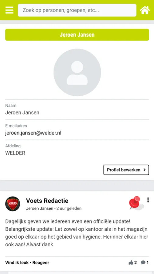 Voets-app; het sociale platform voor jou en jouw collega’s om heel eenvoudig en snel nieuwe kennis, ideeën en successen met elkaar te delen. Dankzij handige features als timelines, eventkalender, groepen, pushnotificaties en speciale community acties word jij realtime geïnformeerd over alles wat er bij jouw werkgever gebeurt. Zo blijf je betrokken bij de organisatie en verbonden met je collega’s kris kras door de organisatie! Samen bouw je aan een gezellige en stevige bedrijfscultuur.