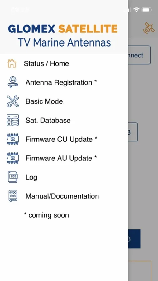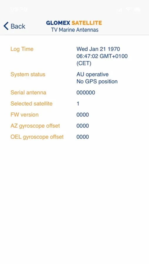 For technicians only. They can update the antenna firmware, update the Control Unit, register the antenna by scanning its QrCode, send antenna logs to Glomex support, and change the satellite frequencies settings