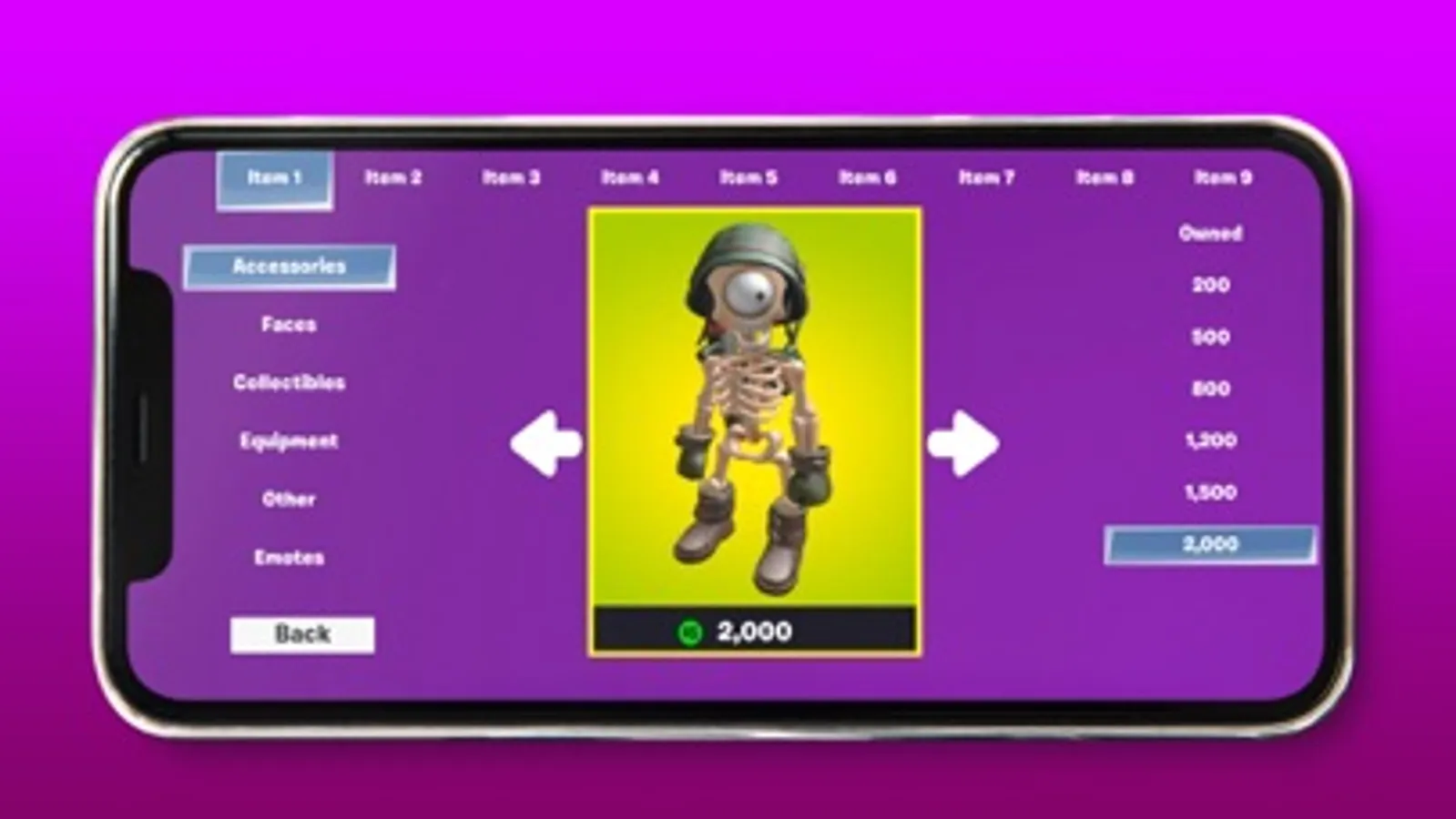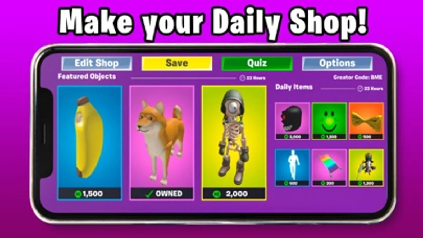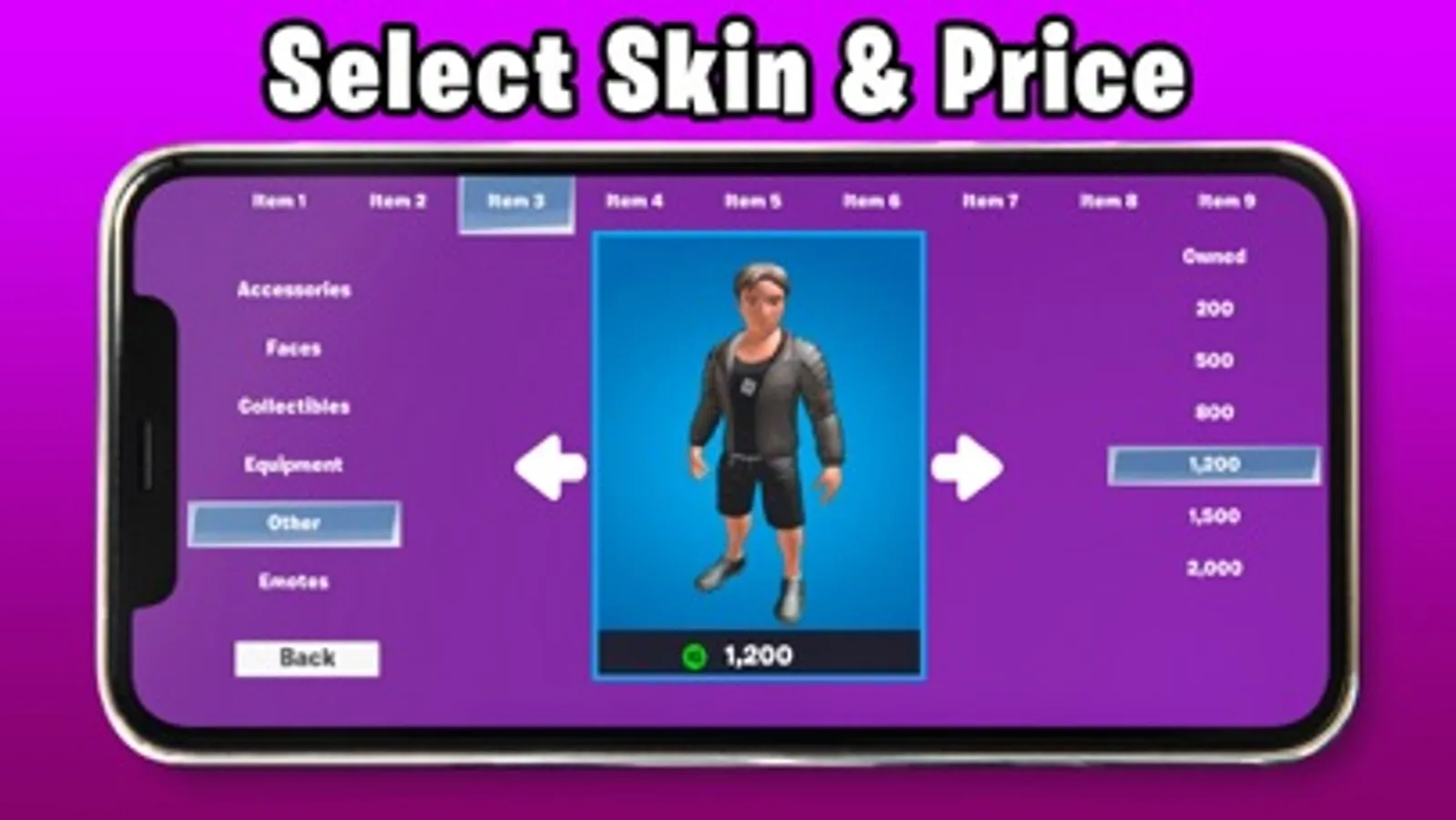 Tap the "Options" button to add your creator code and from the "Edit Shop" button, you can edit or customize your store to your liking. From the shop you can choose the item you want to replace, in the menu on the left you can select the skins, accessories, masks, clothes, body parts, equipment, ect... And from the right side you can change the price of the skins and check the option "In Property". And finally in the top center you have a preview of each item in the store and modify it as you wish.