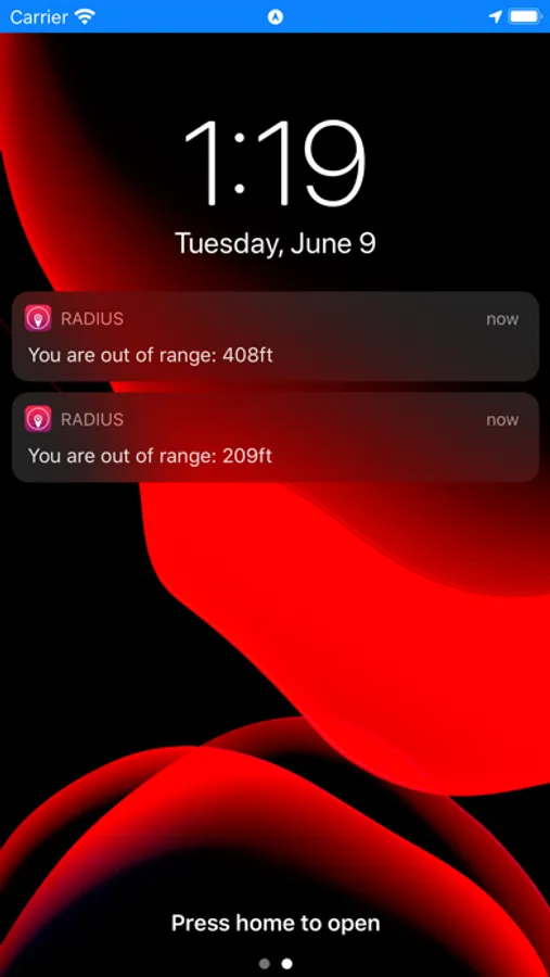 Set you start point and max radius and get notifications when you are out of range.