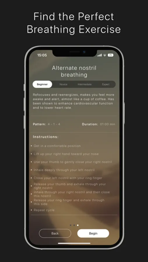 Select your objective, soundscape, exercise and your level ranging from beginner to expert.