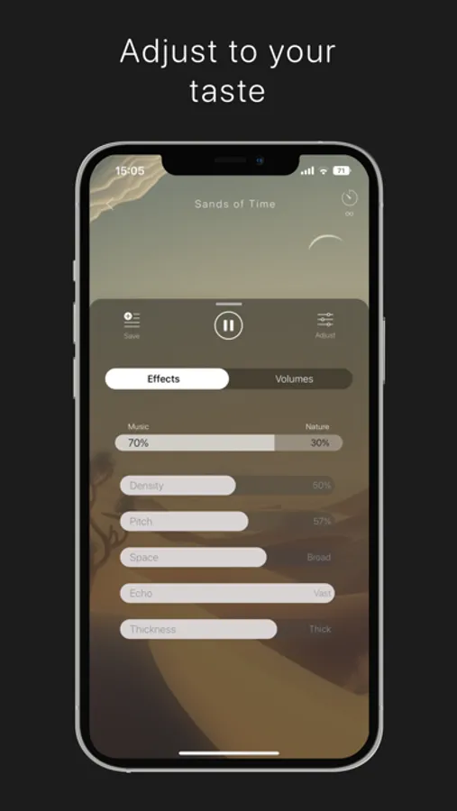 Adjust the volumes for ambient music, mute instruments and feel how the sound affects your mood.