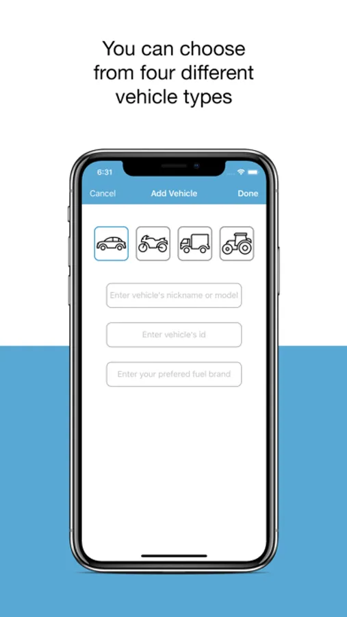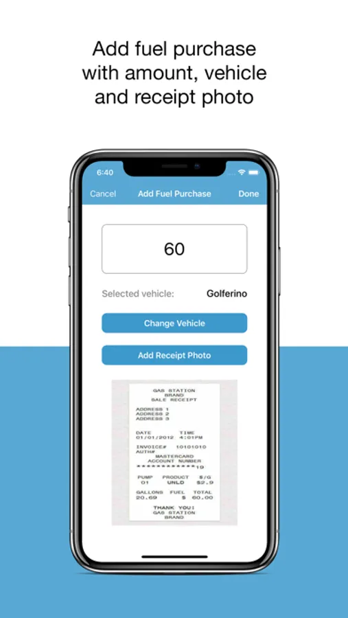 You can add multiple vehicles (4 vehicle types), keep track of your fuel consumption by adding your fuel purchases for these vehicles. You can add receipt photo while adding fuel purchase. You can see receipt at the fuel detail page.