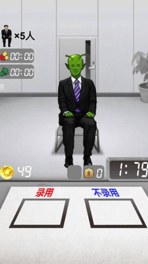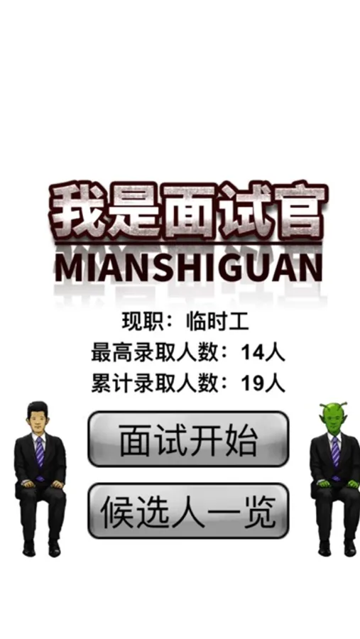 我是面试官是一款考验手速,眼力,分辨能力的一款解压游戏,在游戏中,你是一个英明神武的面试官,很多外星人浑水摸鱼,想要拿到公司机密,所以需要你在面试的时候,分辨后快速踢出外星人,遇到人才把他录用进来。