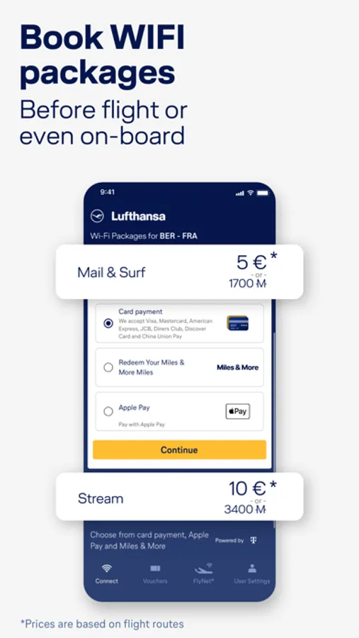 Board, take off and start surfing without delay: from now on you can choose and purchase the Internet access that suits your requirements for your upcoming flight via the app while you are still on the ground. The access is valid for the calendar year of the purchase and the three subsequent calendar years and can only be used once.