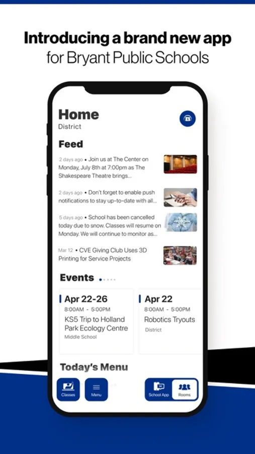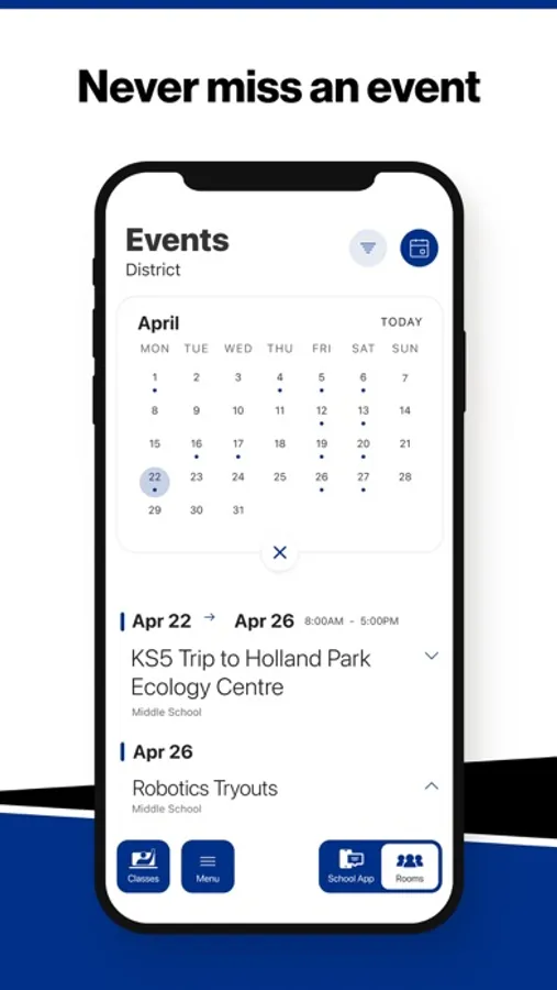 The event section shows a list of events throughout the district. Users can add an event to your calendar to share the event with friends and family with one tap.
