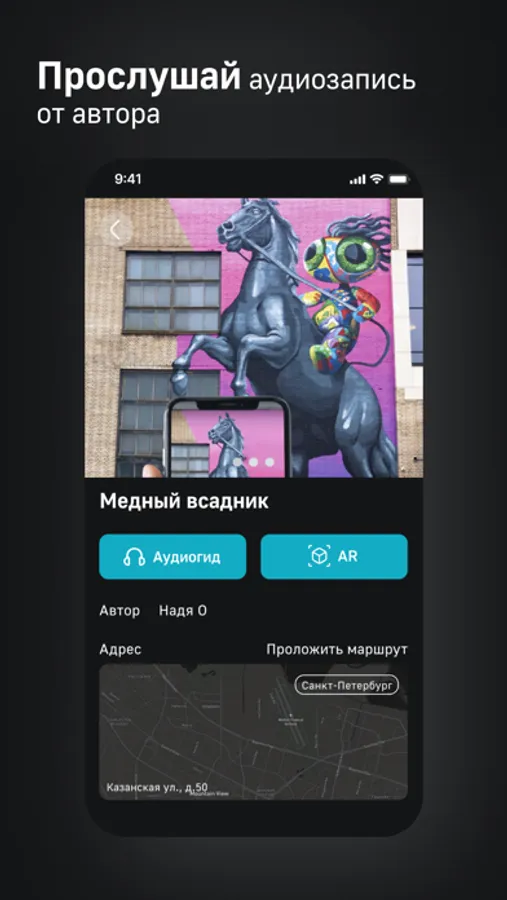 Приложение также оснащено дополненной реальностью (AR). С помощью неё можно не только заглянуть во внутренний мир уличного искусства, но и увидеть исчезнувшие объекты.