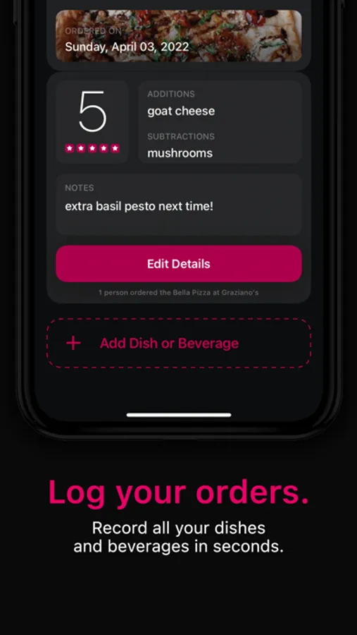 • Note anything you substituted or added to a dish, along with a rating, photo, and whether you'd reorder it next time