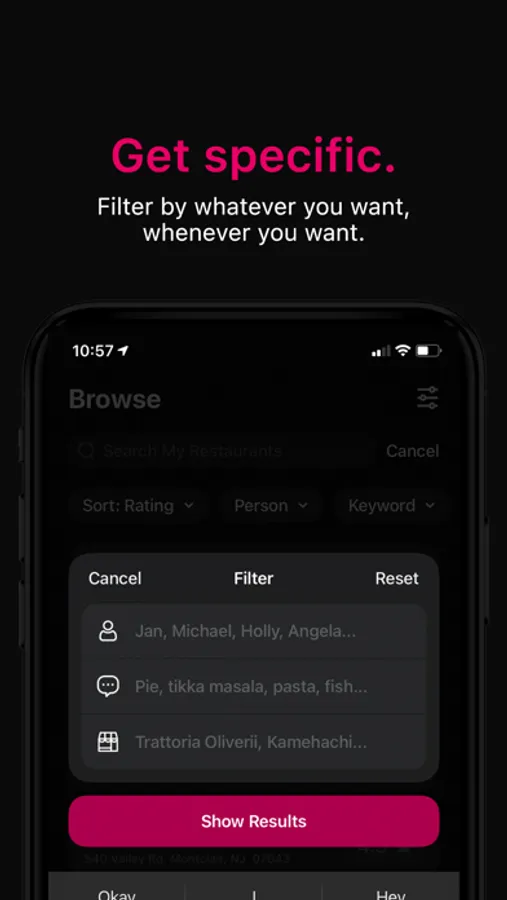 Dining out with friends or family? Amazing. So if you want to search for your dad's favorite spot to order spaghetti bolognese or your girlfriend's favorite sushi place within a 10-mile radius, it's as easy as pie. Also, pie. You can record that.
