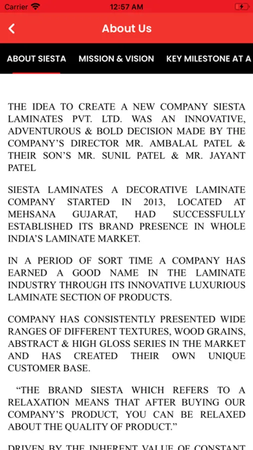 Siesta laminates Basically is selling laminates of different design and quality. It's one of the well known company in Gujarat based. This app is basically for our customers to know about the products and design. We are providing facility where they can try using different laminates designs how's its going to look at Kitchen, Bedroom and more. User can find out company distributors location across is india and about company details too.