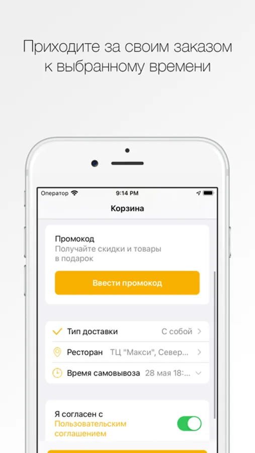 Укажите время, когда хотите прийти за своим заказом или выберите доставку с указанием времени и адреса доставки.