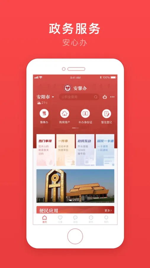 “安馨办”是安阳市政府为深化“放管服”改革、提升政务服务能力、落实“四个办”要求,与建设银行合作开发的一款智慧城市服务APP,旨在为安阳市广大市民和企业提供更为高效、便捷的掌上办事服务渠道。“安馨办”采用新一代技术架构实现了融政务服务、便民服务和普惠金融服务三大服务板块为一体的城市综合服务平台。群众通过刷脸认证等多形式验证登录后,即可一站式办理公安、交通、医保、社保、民政等多部门业务,以及水、电、气、暖等公共服务事项。安阳市行政便民服务中心成立于2001年10月,主要负责各部门进驻事项办理的组织协调、监督管理和指导服务;受理群众对行政机关及其工作人员的意见、建议和投诉。设有行政便民服务大厅、12345联动服务中心(市长便民公开电话)、行政便民网站(市长信箱、在线访谈)等工作机构。各县(市、区)均设有行政便民服务中心,乡(镇、街道)和村(社区)设有为民服务全程代理站点,市行政便民中心在城区还设有房产交易、车驾管、公积金,水务、燃气和供电6个分中心,形成了上下联动、便捷高效的市、县(市、区)、乡(街)、村(社)四级行政便民服务体系。“安馨办”--您身边的安阳市民之家。