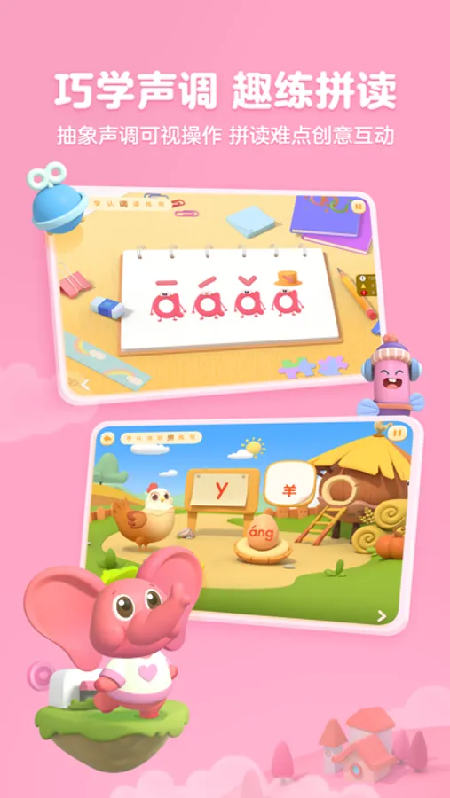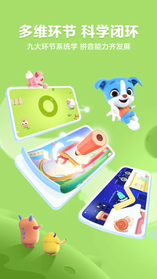 为每个拼音定制学、认、调、读、拼、练、写等九大环节,让拼音学习阶梯式进行。